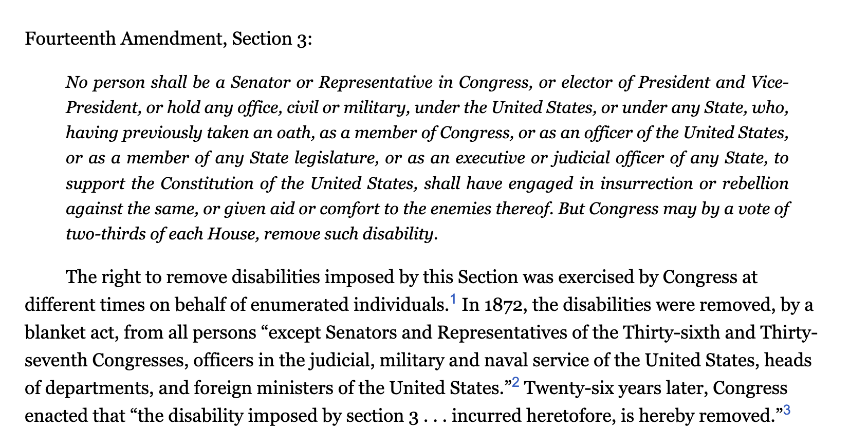 他们和其他法律学者的论点基于对宪法第14修正案部分内容的解读,这是内战后的一项宪法条文规定 —— 将任何以前作为宣誓就职的公职人员“参与叛乱或叛乱......或[曾]向政府的敌人提供援助或安慰”,都会被取消再次竞选联邦公职资格。